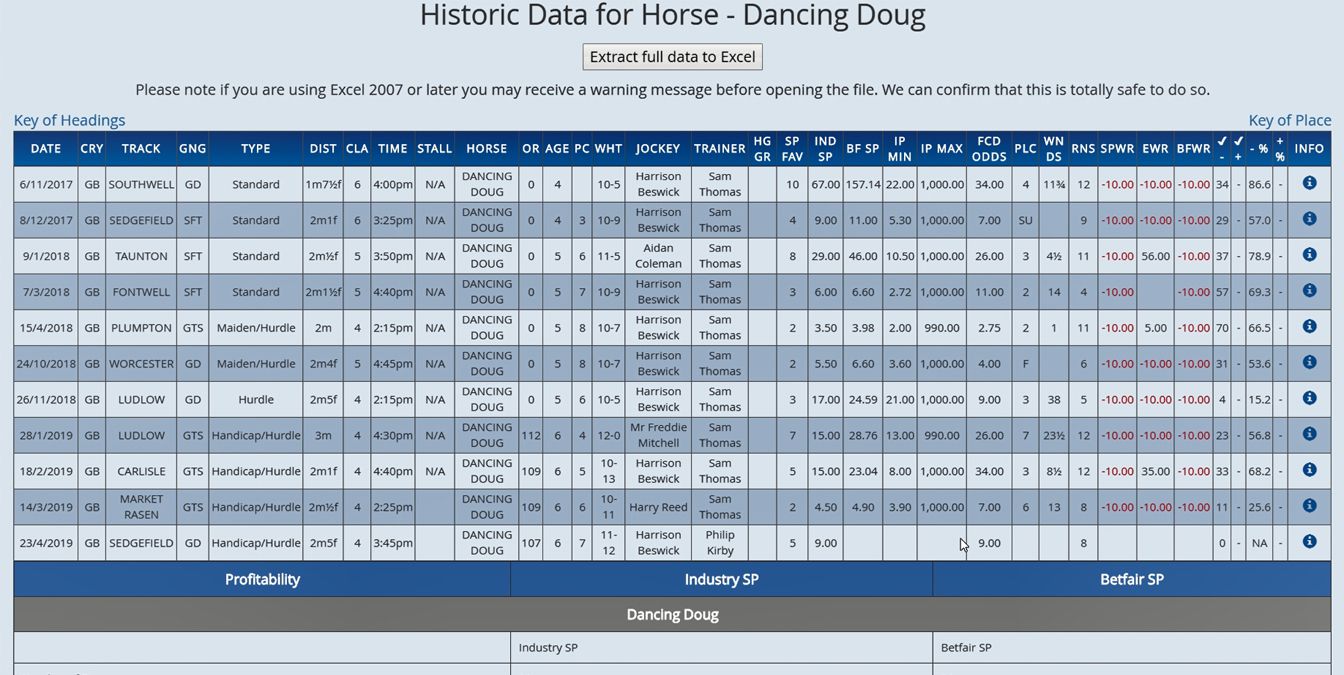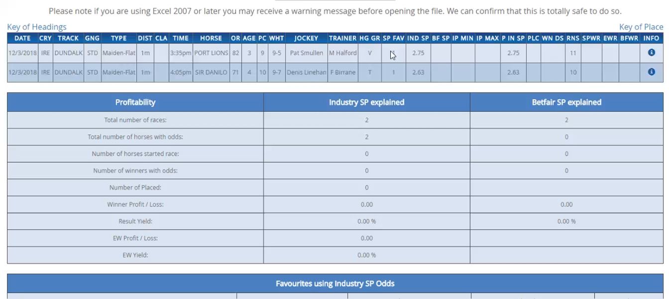 The landing page for each download give screenshots and video guides that explain the basics of the output. In summary though, the pre-race download details each horse running today's full history. This includes odds, odds reduction/inflation (compares SP to Inplay High and Low).