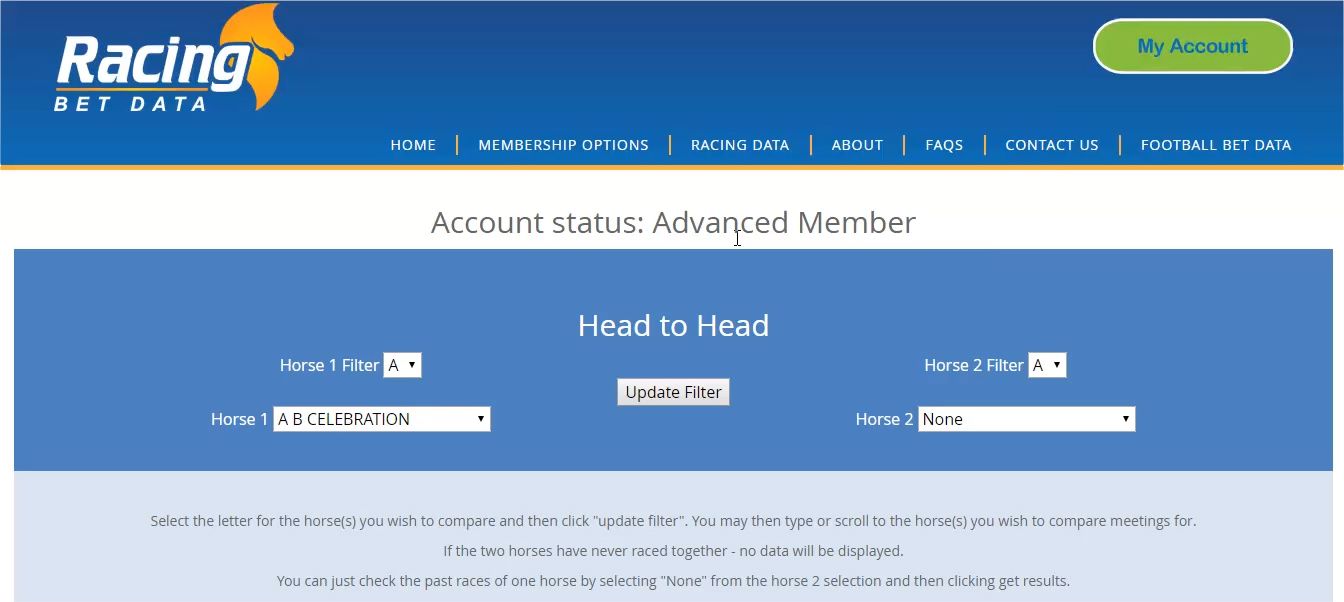 Using our head to head option from the top menu you can analyse 2 horses performance against each other. Select the first letter of each horse from the drop down boxes and click the "Update filter" box. Then using the drop down menu you can select the horses you want to compare by either typing their name or scrolling to the relevant place. Click "Get results" once you have chosen your two horses and the output for each will be displayed below.